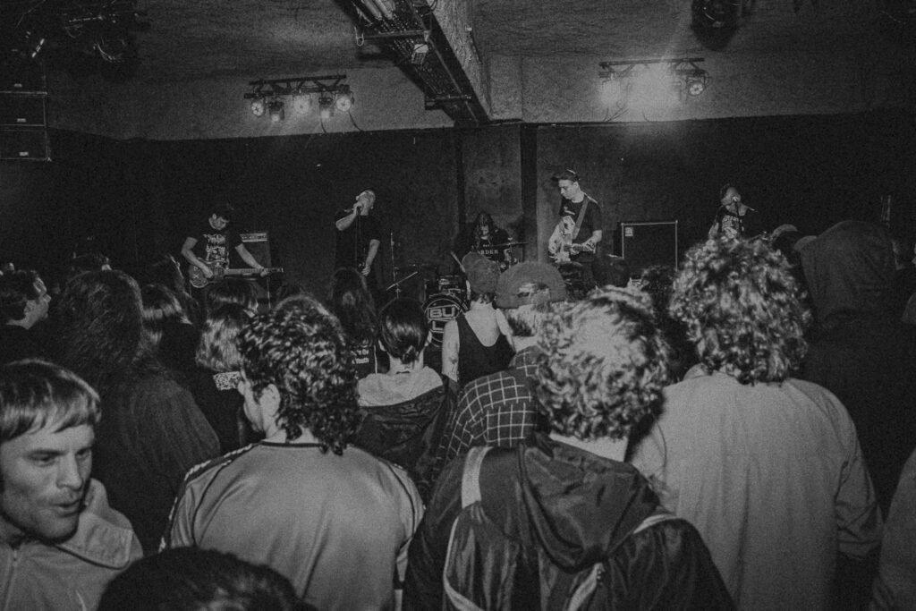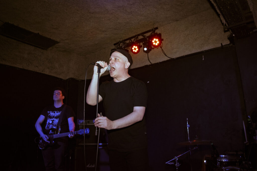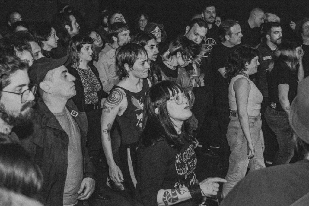 Ya en sus puestos, los Tensión comenzaban el ataque con “Erosión”. Guitarras ásperas y bajo punzante marcaron un pulso inmediato: la rabia hecha carne en un set frágil y feroz al mismo tiempo. Le siguieron “Estado de aislamiento” y la profunda “Sí mismo”, piezas que alternaban entre la introspección existencial y la furia social, siempre sostenidas por una batería frenética que parecía latir en sincronía con el cuerpo colectivo de la sala.